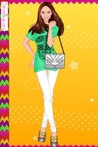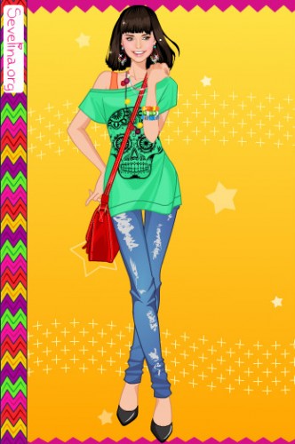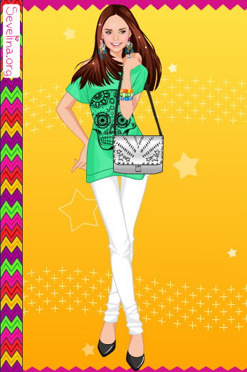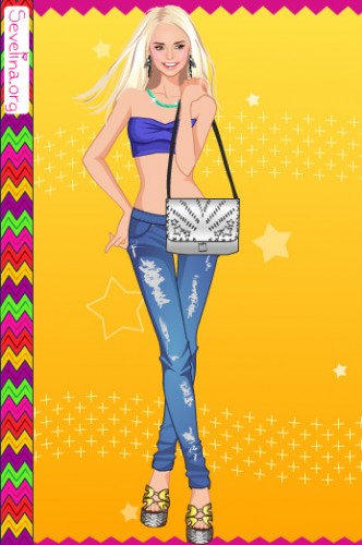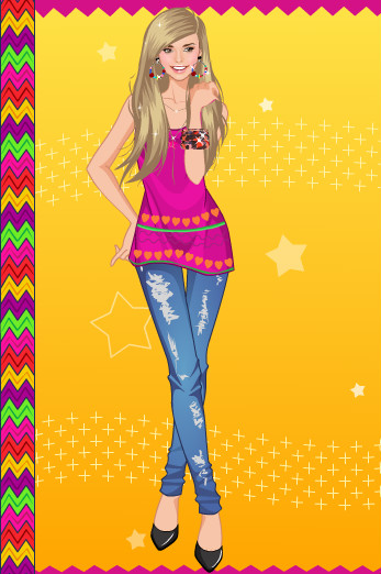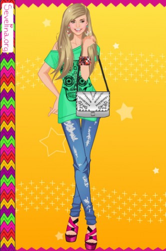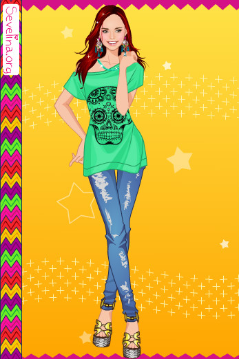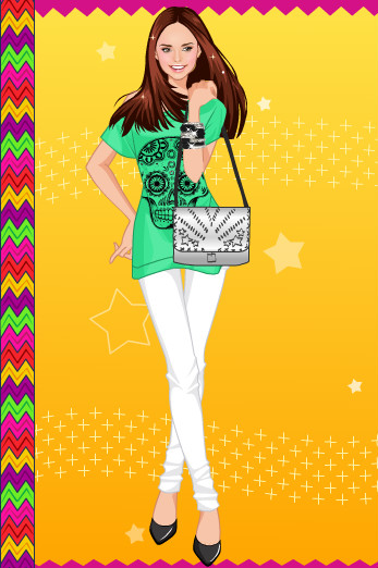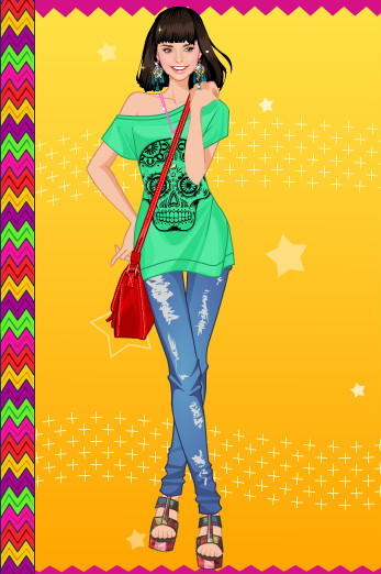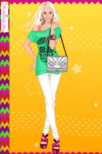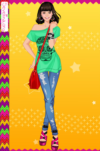 Мой вариант:синие джинсы,зелёная футболка,2 ряд 2 причёска,розовые босоножки,чёрные браслеты и 1 серёжки